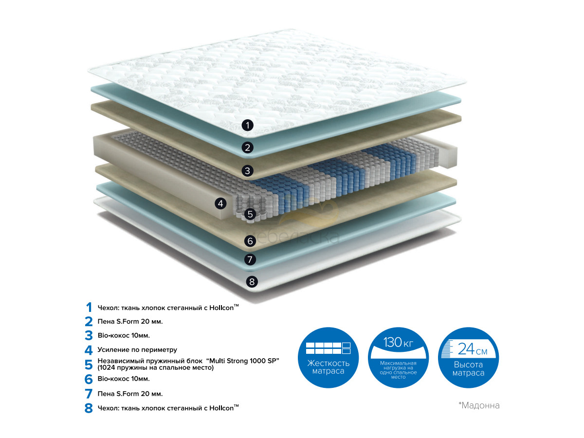 Наполнение : Блок независимых пружин MultiSTRONG" - 1024 пружины, 5 зон + Ортопедическая пена 2см + био-кокос + усиление по периметру коробом ППУ