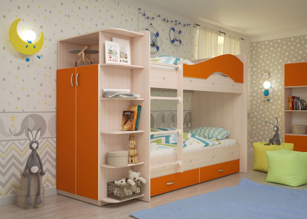 - Двухъярусная кровать со шкафом Мая щиты оранжевый