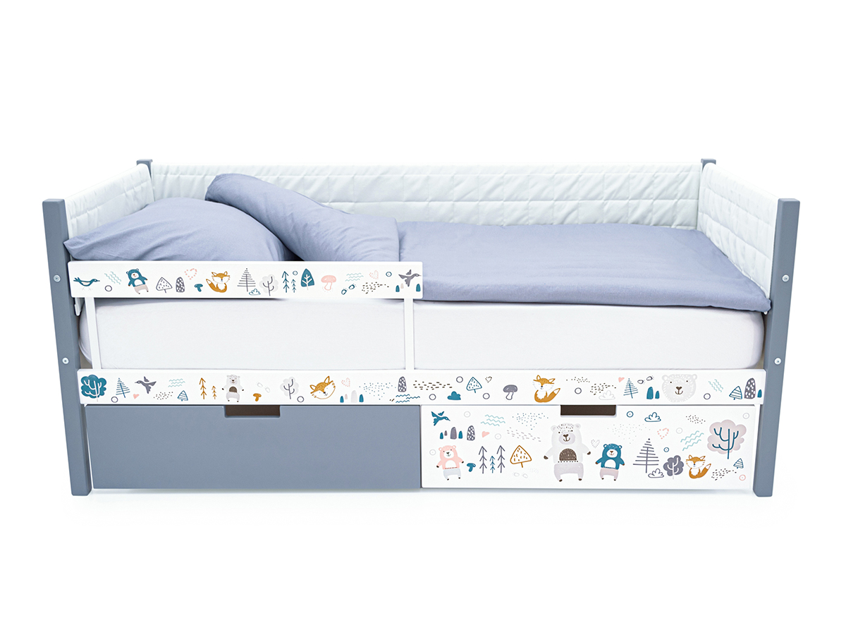 Кровать-тахта Svogen мягкая с ящиками и бортиком с фото графит/мишки