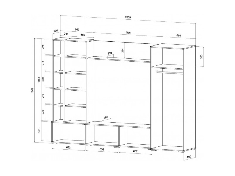 Габариты: 2669 (ширина) х 480 (глубина) х 1862 (высота) мм.