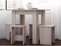 Большой популярностью пользуются обеденные группы. Они идеально подходят для комплектации кухни или столовой удобной мебелью, выдержанной в едином стиле. Чаще всего набор мебели включает в себя стол и стулья или табуреты к нему. Причем их стиль и материалы изготовления полностью одинаковы. Для изготовления обеденной группы чаще всего используется древесина, а ножки выполняются из металла, что обеспечивает устойчивость моделей.