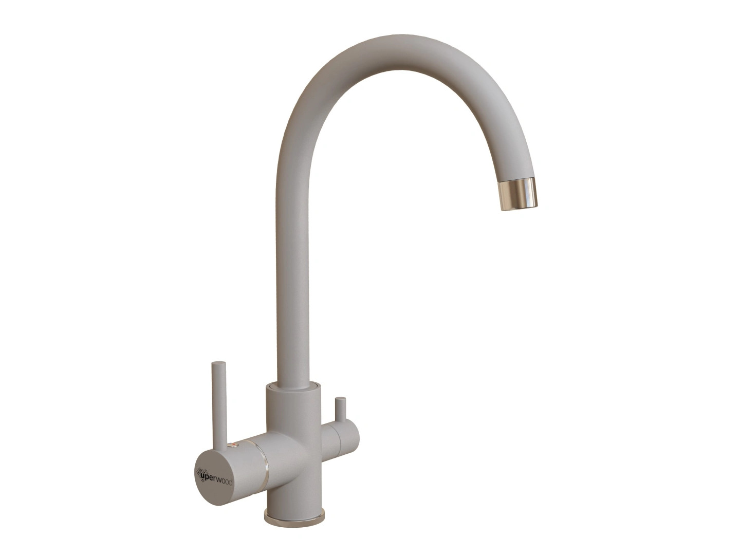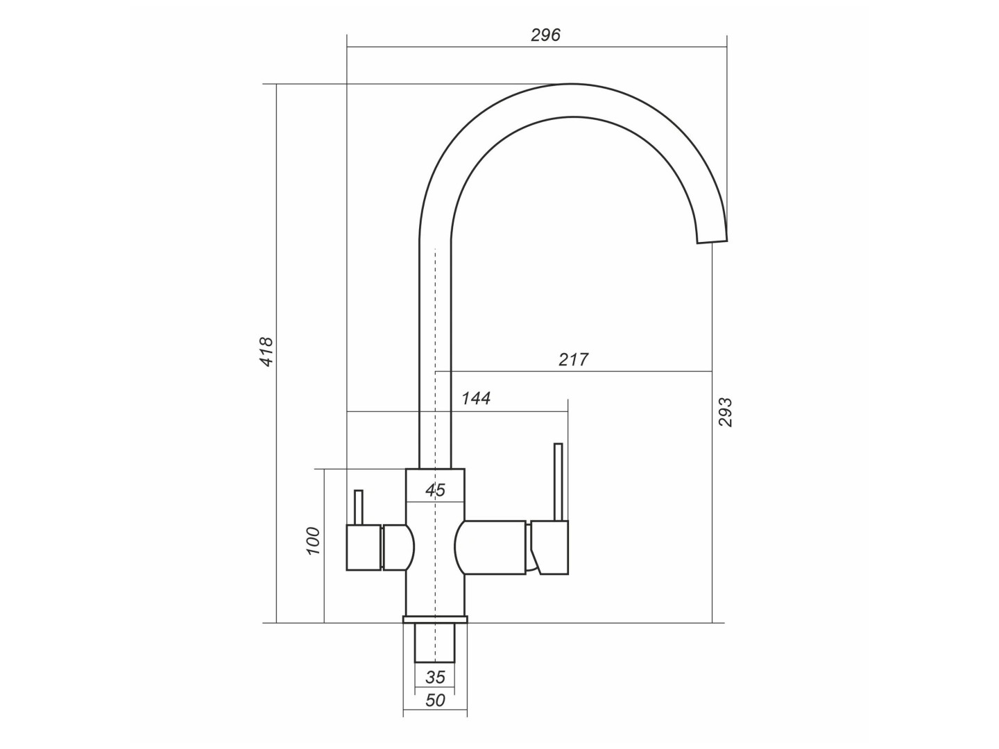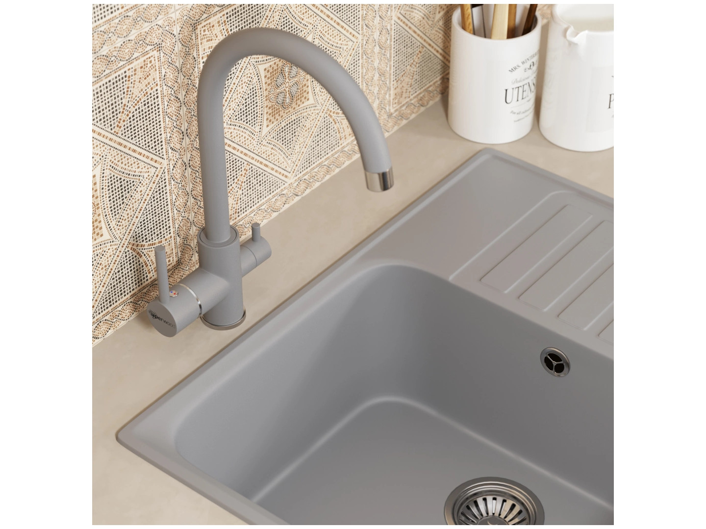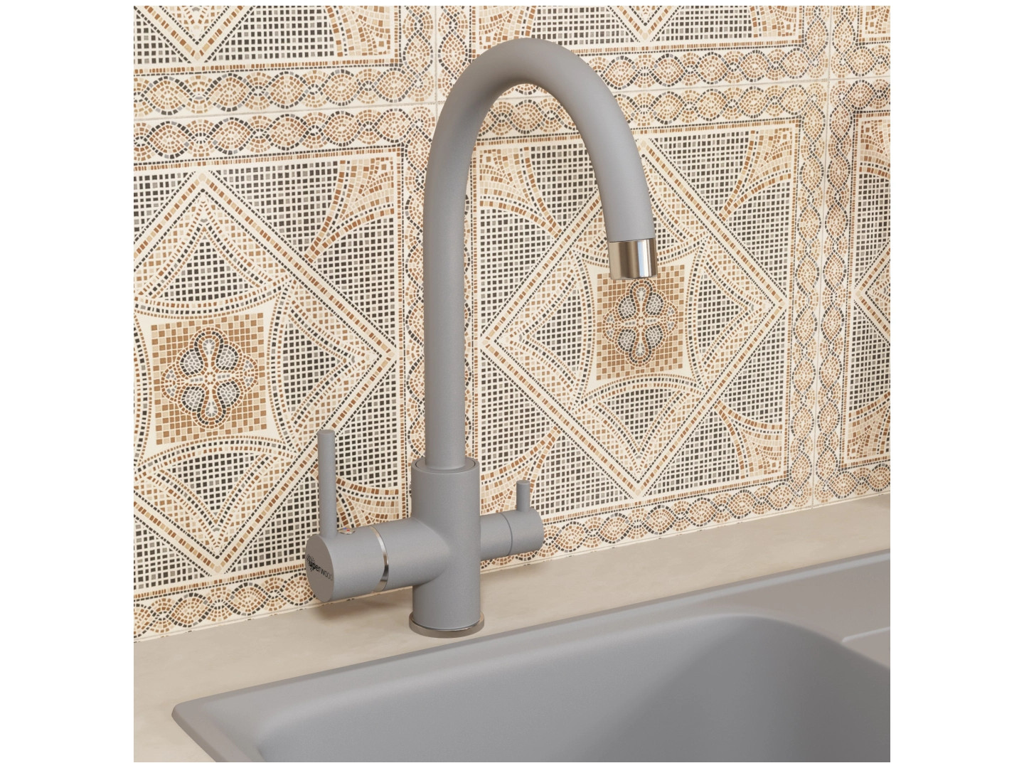 Смеситель оснащен встроенным фильтром для питьевой воды. Рычажное управление, керамический картридж 35 мм. Поворотный излив. Съемный аэратор. Гибкая подводка 45 см. Усиленная гайка крепления смесителя.