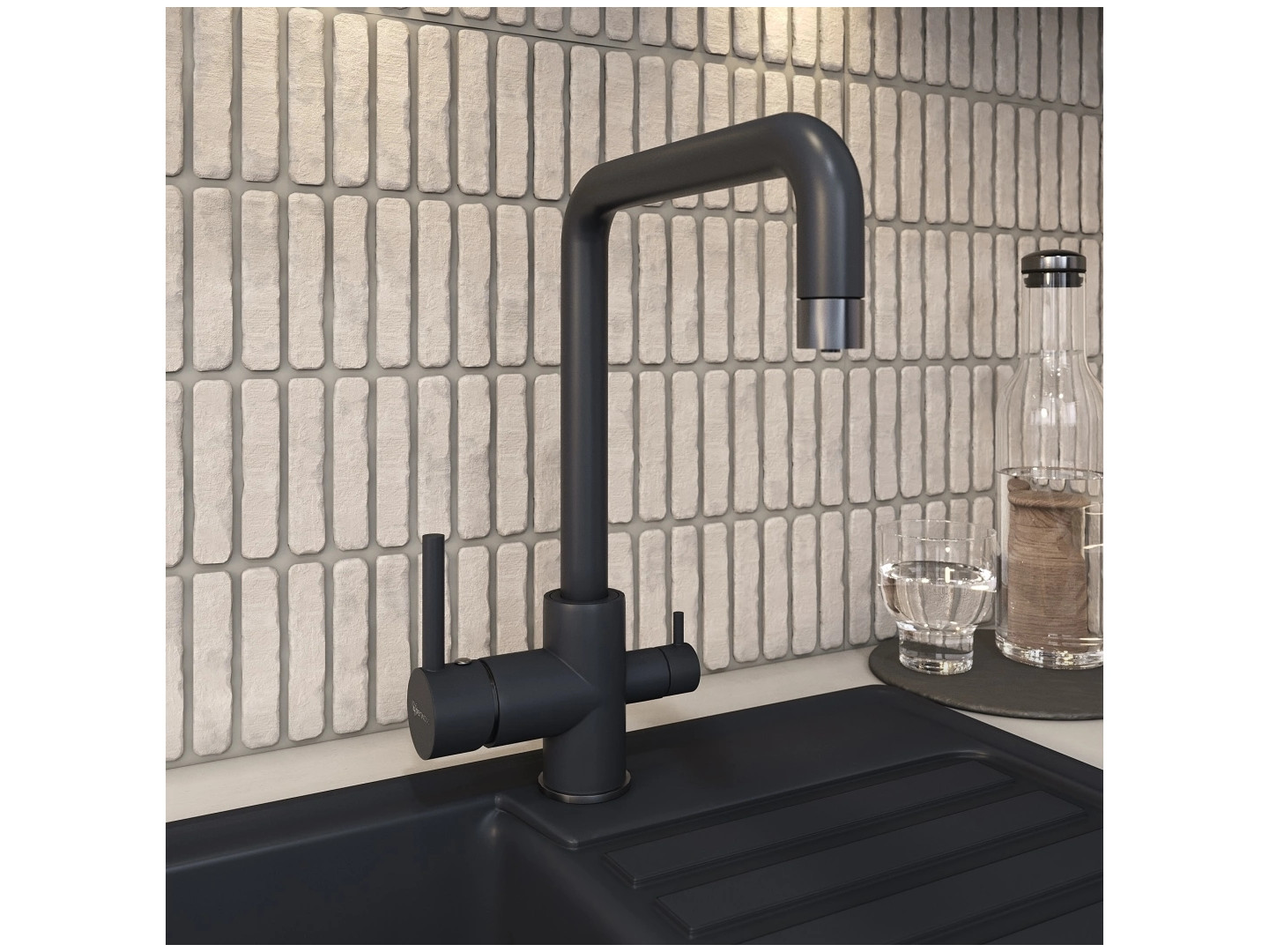 Смеситель оснащен встроенным фильтром для питьевой воды. Рычажное управление, керамический картридж 35 мм. Поворотный излив. Съемный аэратор. Гибкая подводка 45 см. Усиленная гайка крепления смесителя.