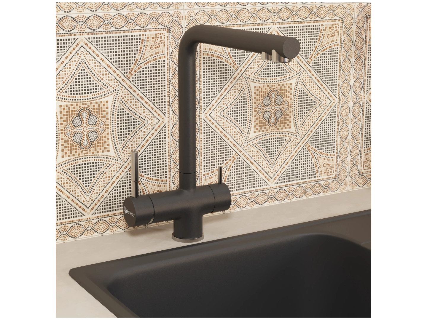 Смеситель оснащен встроенным фильтром для питьевой воды. Рычажное управление, керамический картридж 35 мм. Поворотный излив. Съемный аэратор. Гибкая подводка 45 см. Усиленная гайка крепления смесителя.