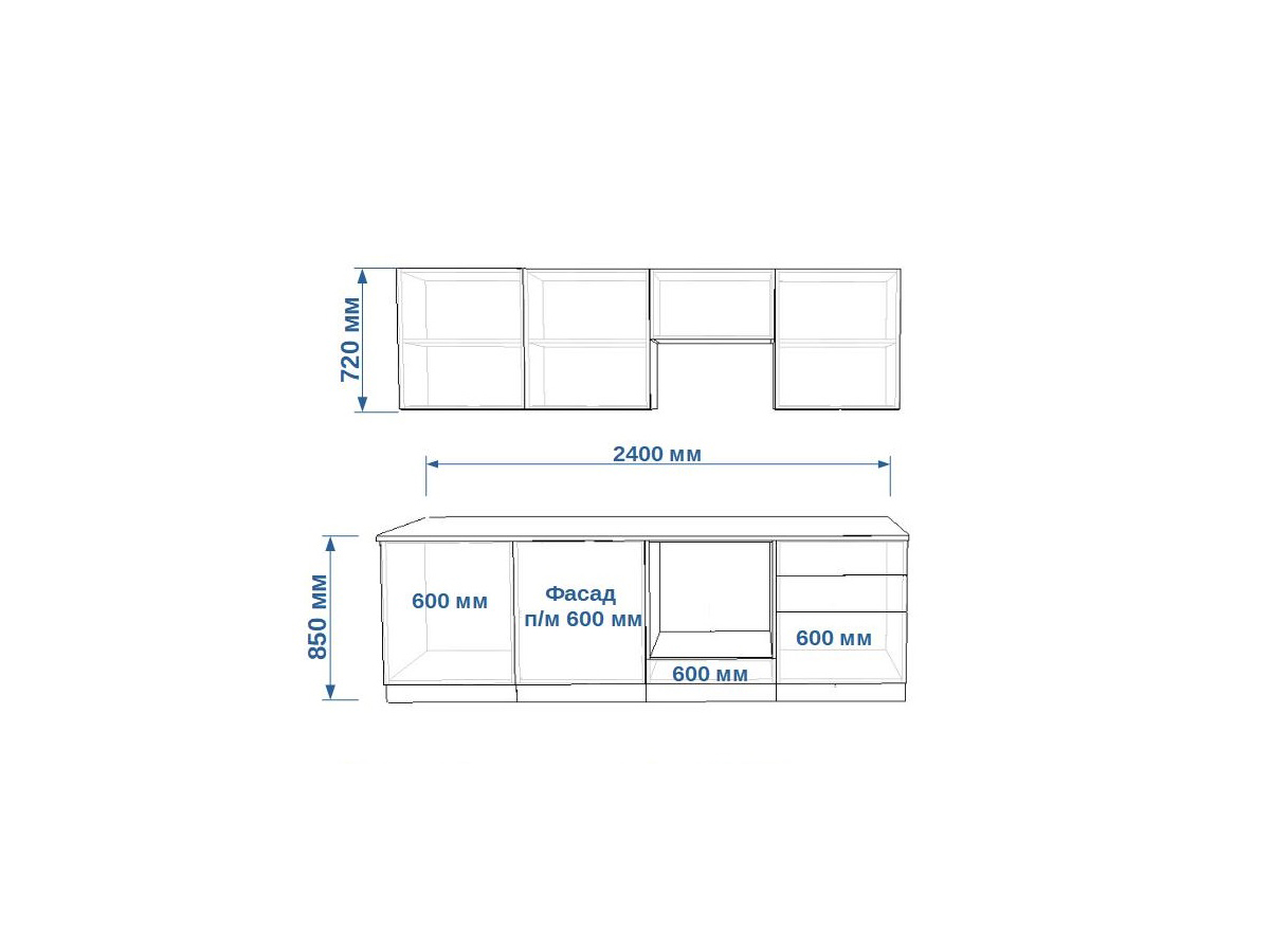 Кухонная мойка, стеновая панель, посудосушитель, планки для столешницы в комплект не входят.