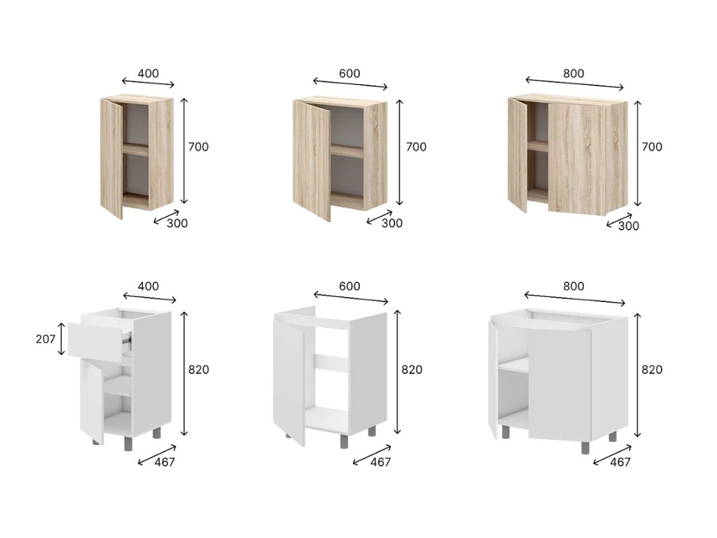 - Шкаф нижний одностворчатый под мойку (ширина 60 см, глубина 46,7 см, высота 82 см).