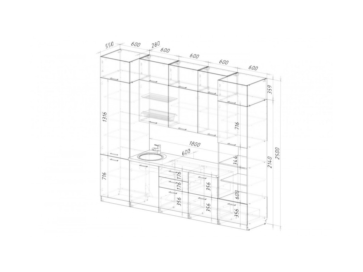 Мойка, смеситель, стеновая панель и посудосушитель в комплект гарнитура не входят.