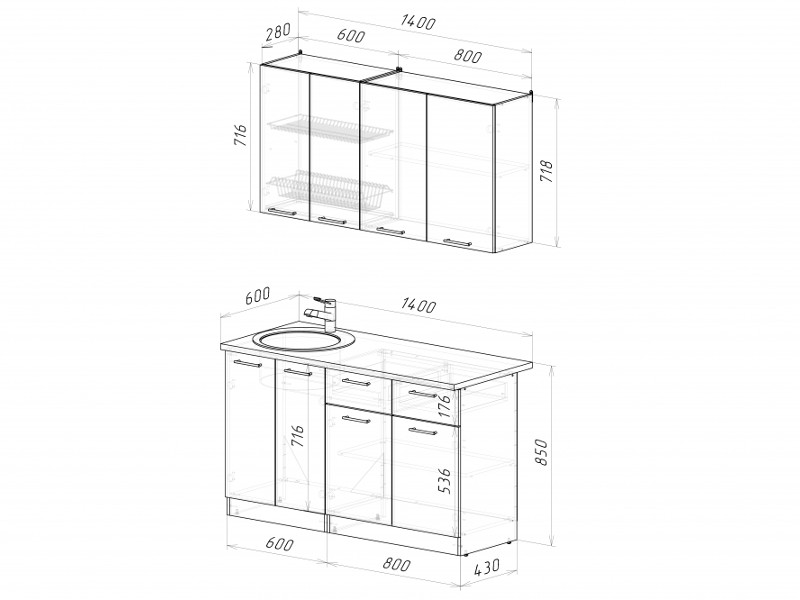 Мойка, смеситель, стеновая панель и посудосушитель в комплект гарнитура не входят.