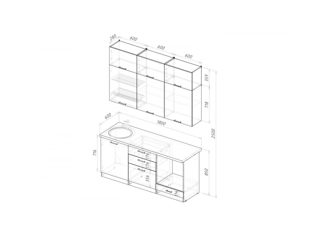 Мойка, смеситель, стеновая панель и посудосушитель в комплект гарнитура не входят.