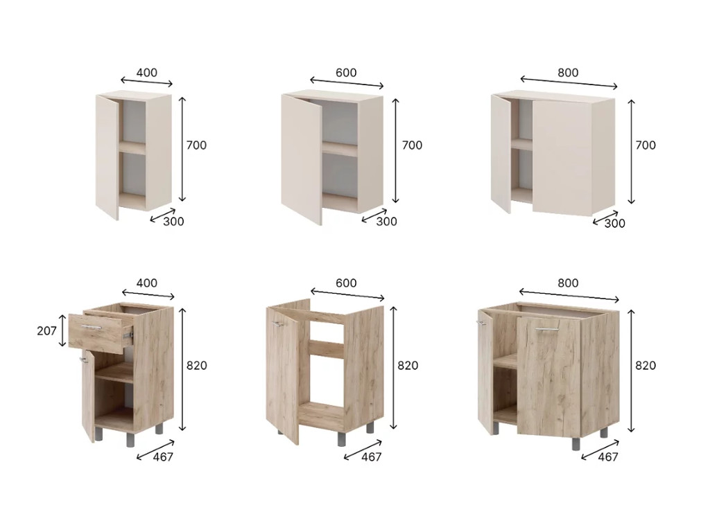 - Шкаф нижний одностворчатый под мойку (ширина 60 см, глубина 46,7 см, высота 82 см).