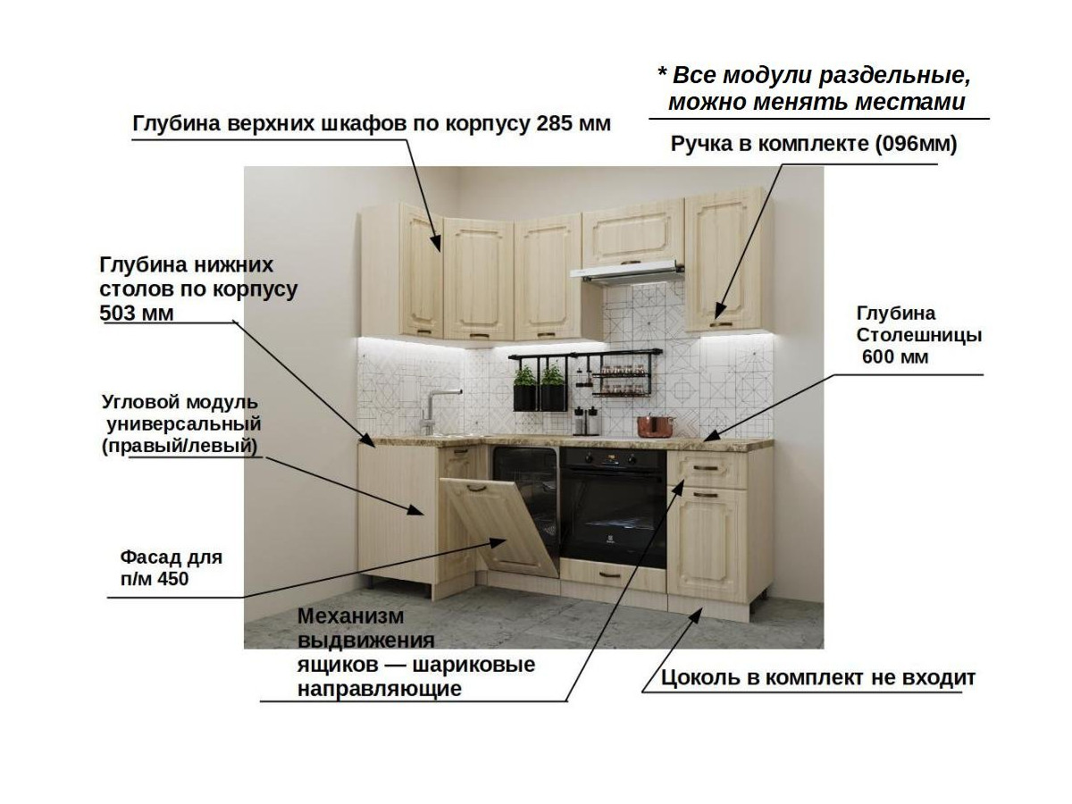 Кухонная мойка, стеновая панель, посудосушитель, планки для столешницы в комплект не входят.