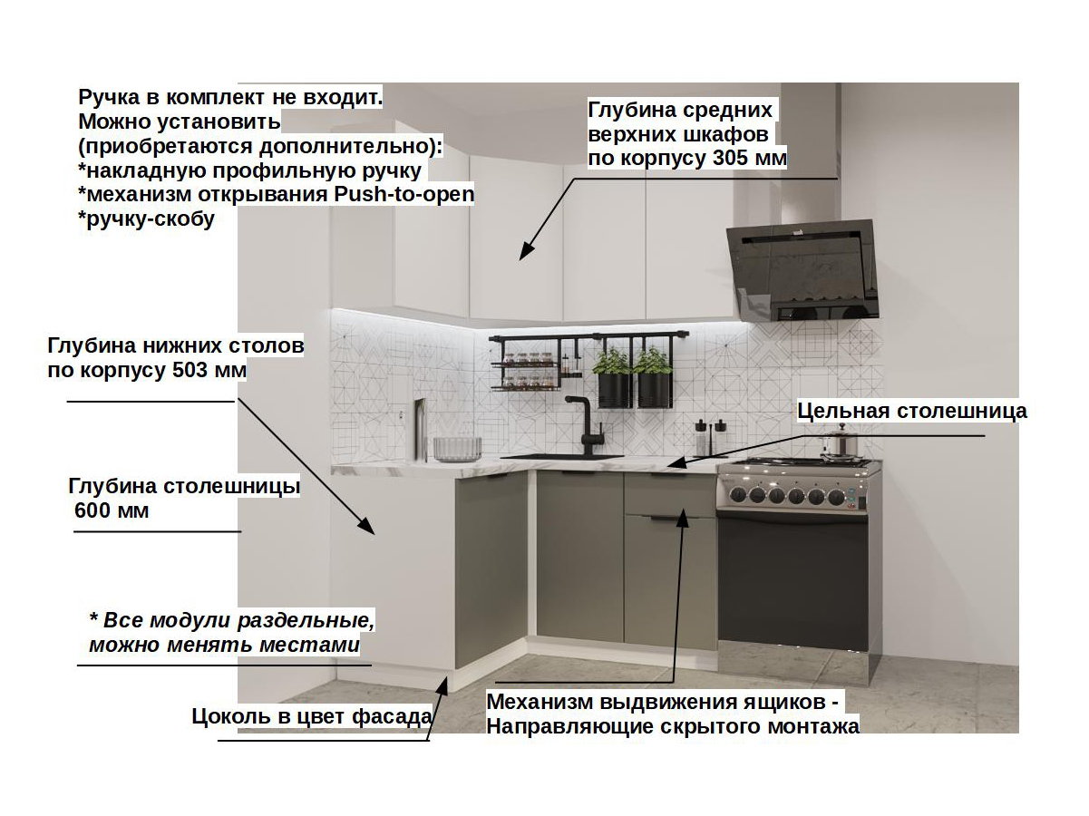 Кухонная мойка, стеновая панель, посудосушитель, планки для столешницы в комплект не входят.