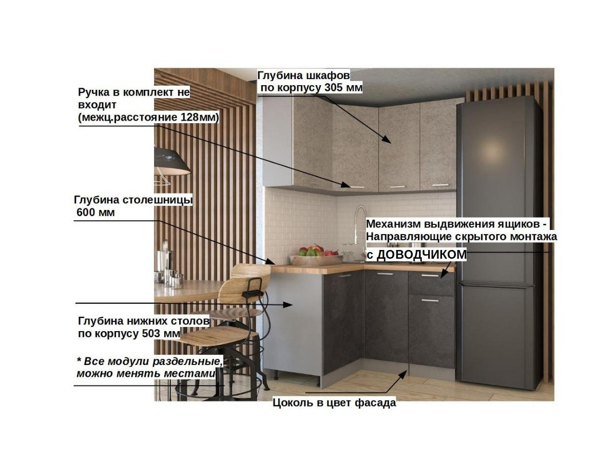 Кухонная мойка, стеновая панель, посудосушитель, планки для столешницы в комплект не входят.