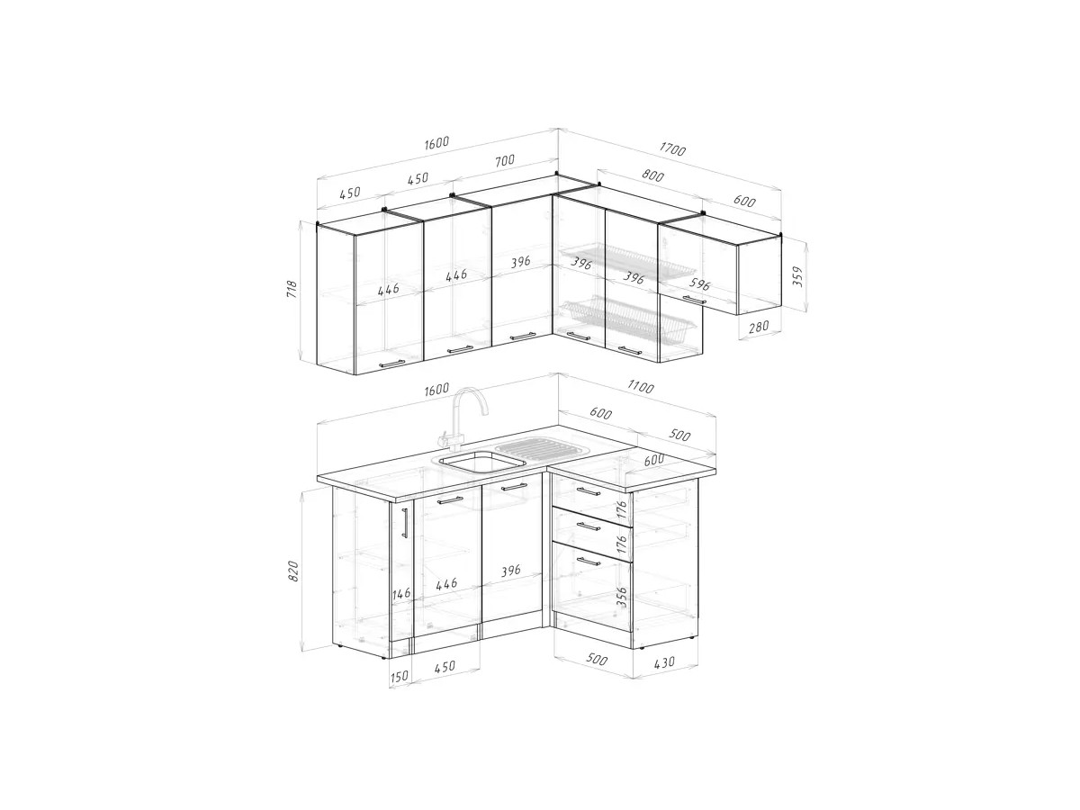 Мойка, смеситель, стеновая панель и посудосушитель в комплект гарнитура не входят.