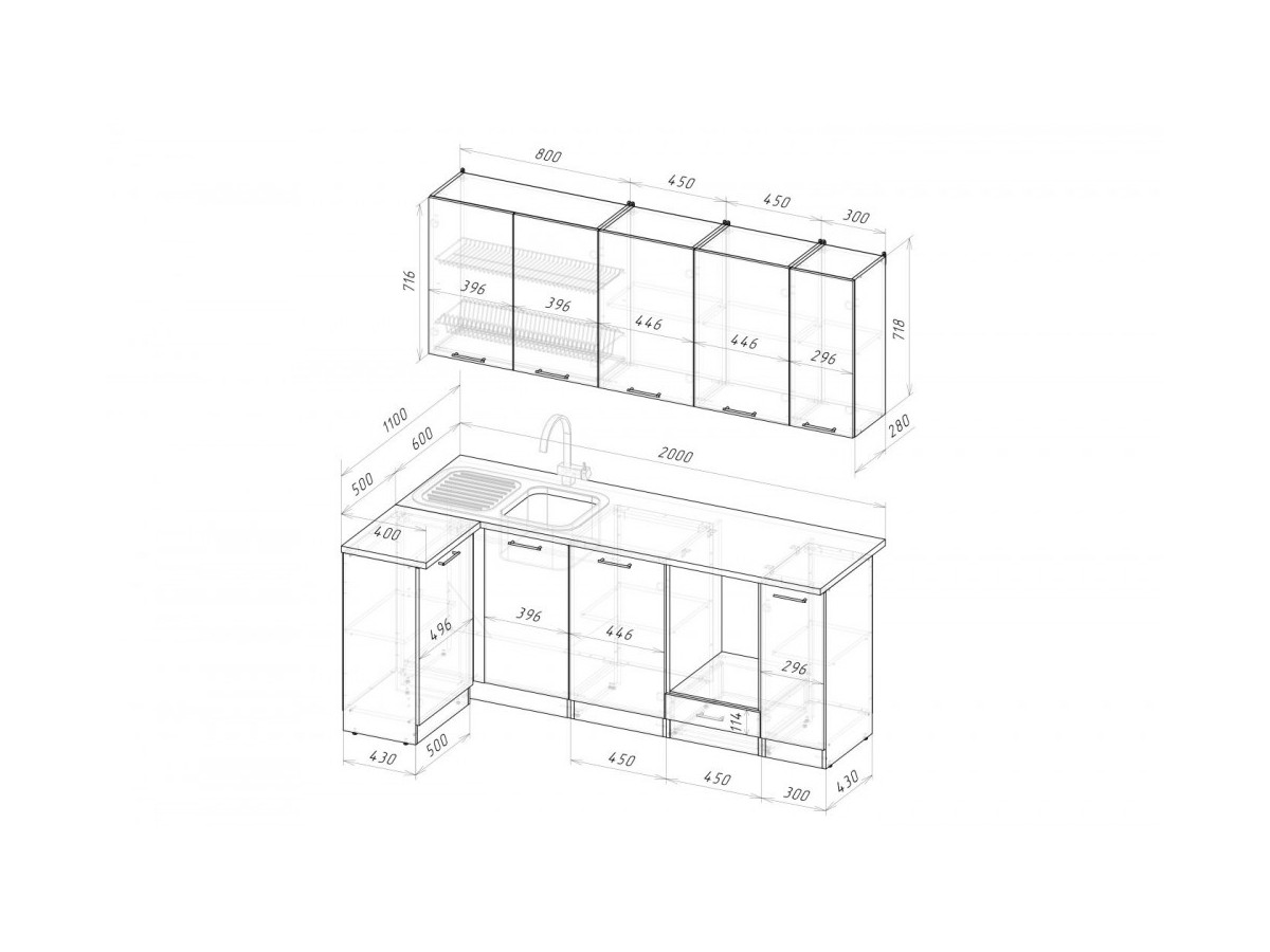 Мойка, смеситель, стеновая панель и посудосушитель в комплект гарнитура не входят.