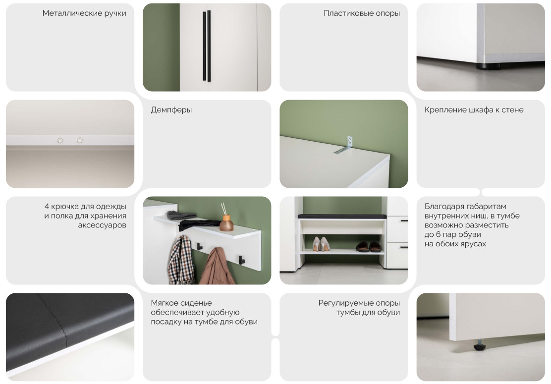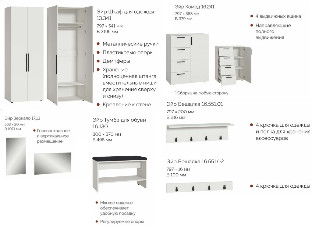 Цена за комплект: Комод 16.241, Вешалка 16.551.01, Вешалка 16.551.02, Зеркало 17.13 , Тумба для обуви 16.130, Шкаф для одежды 13.341