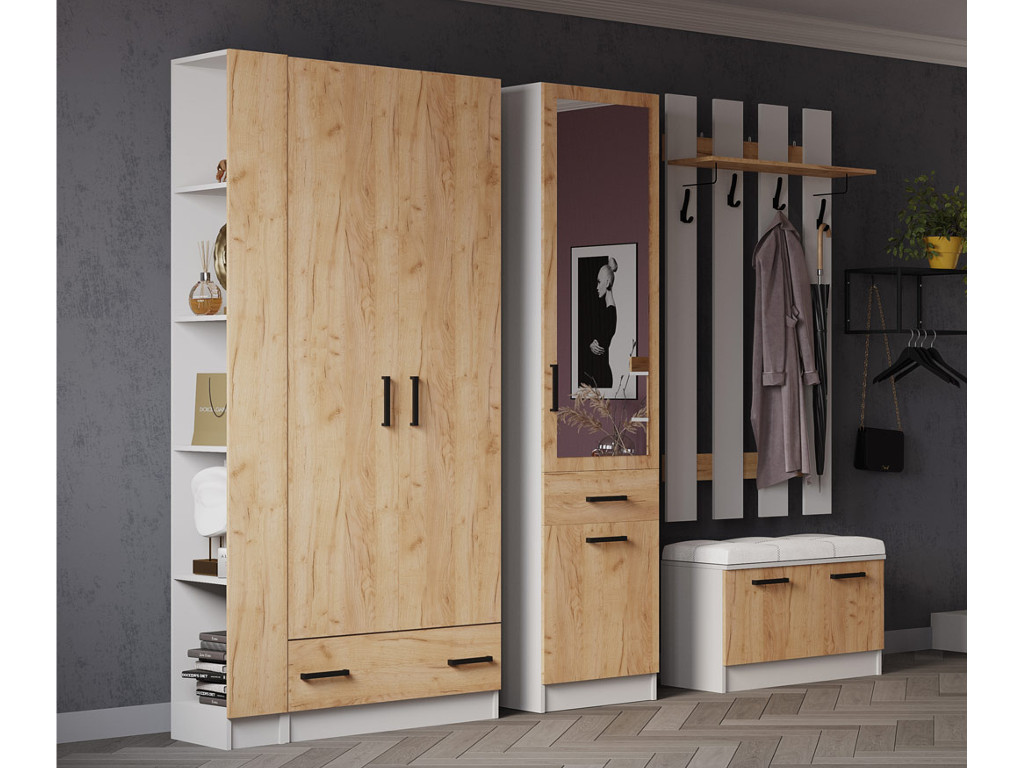 Цена за комплект: Торцевое завершение, Шкаф, Пенал с зеркалом, Тумба 800, Вешалка 800, Сиденье мягкое 800