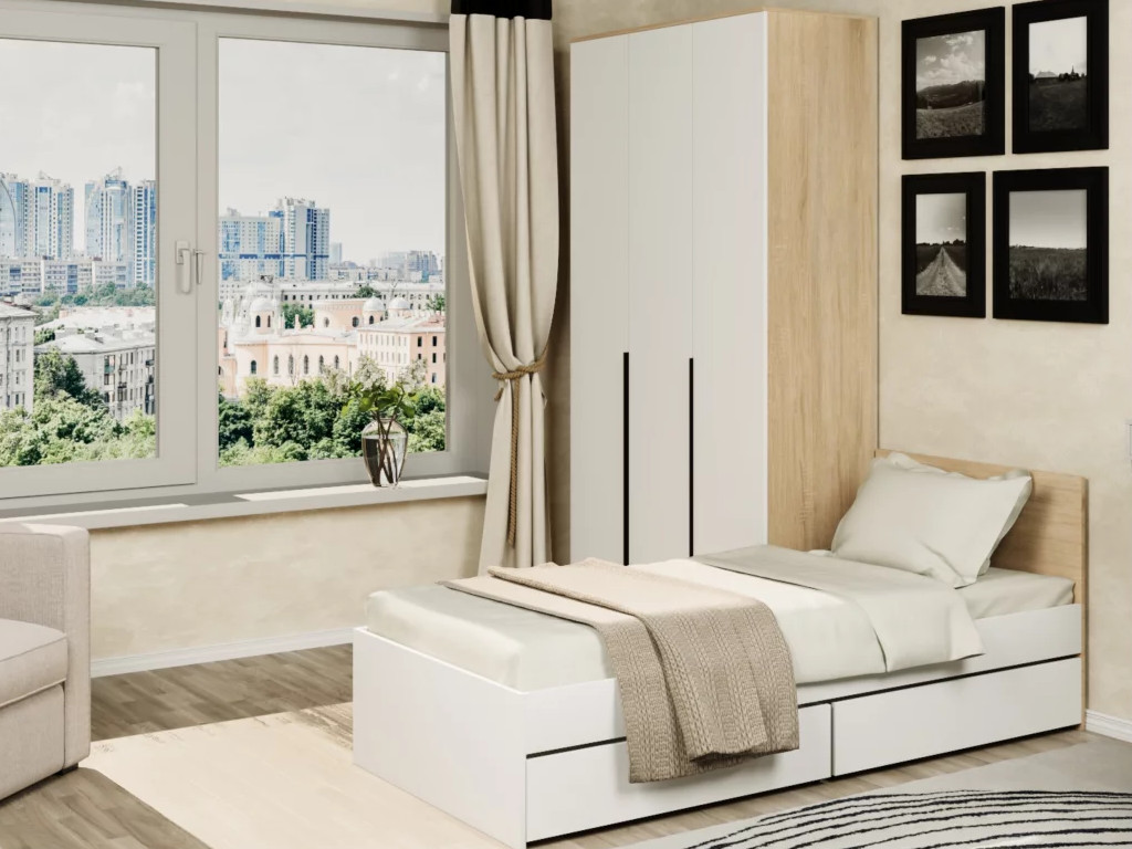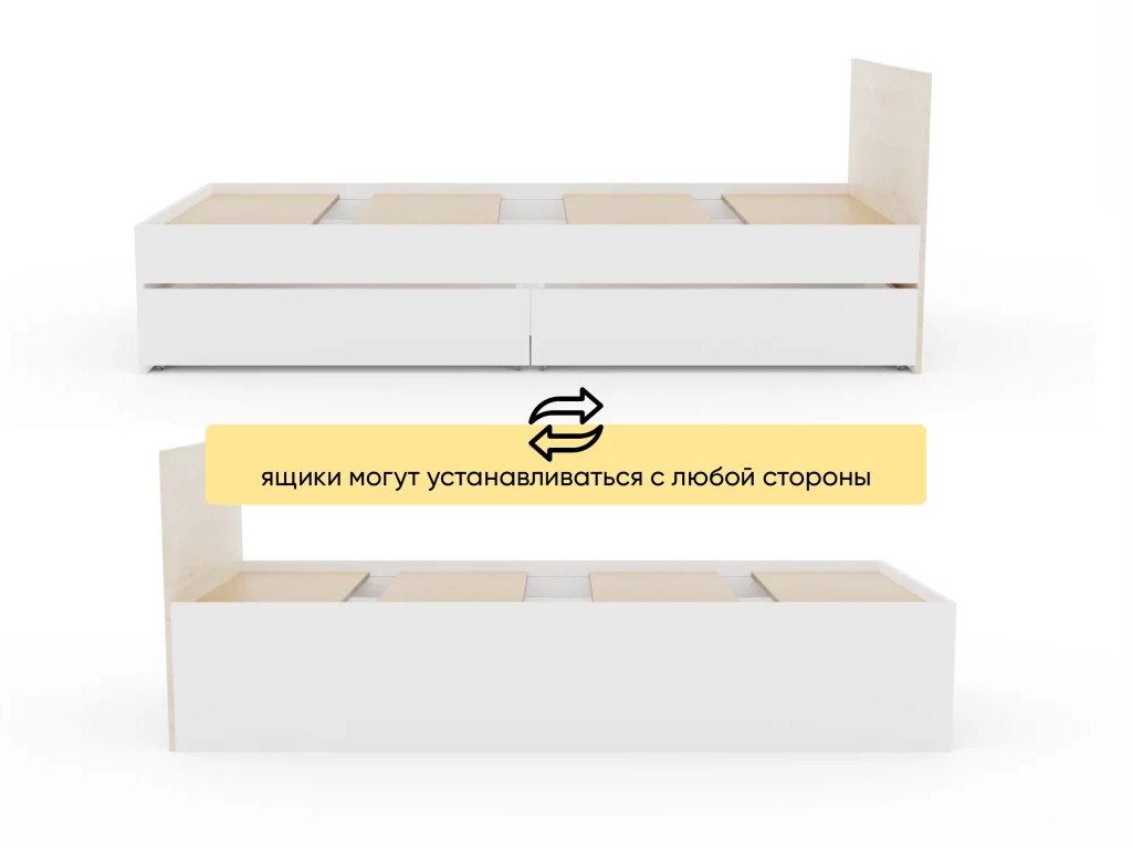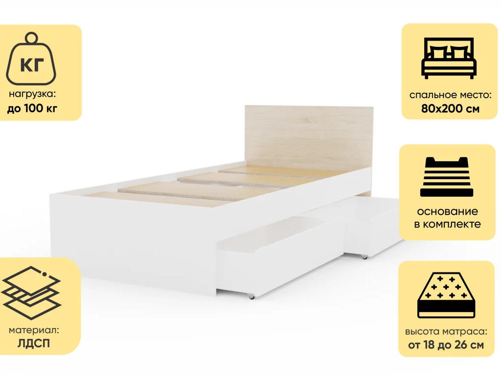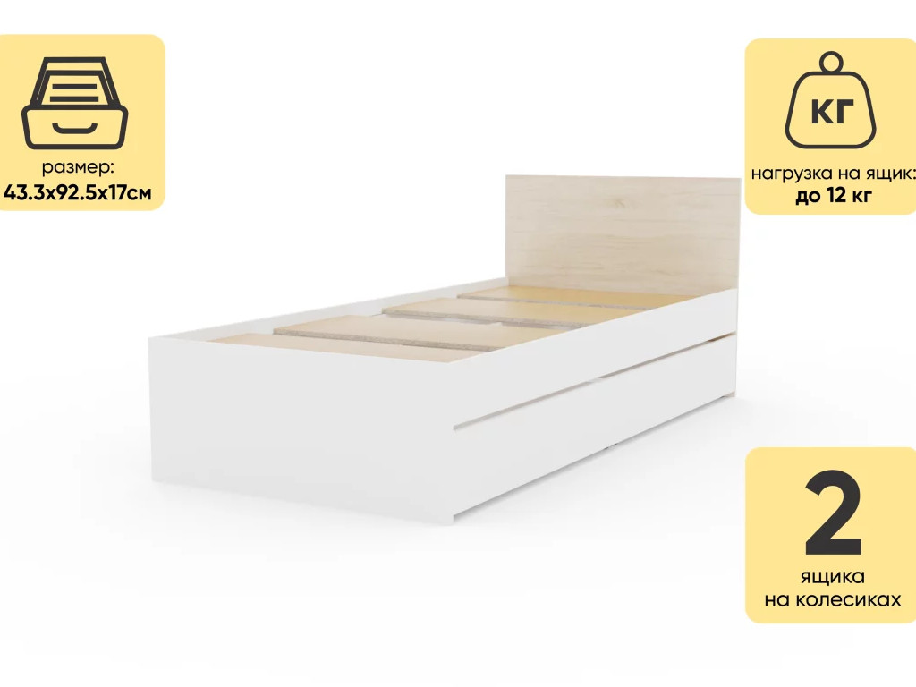 - Кровать Монблан Kids с ящиками 80х200 см Белый Шагрень-Дуб сонома