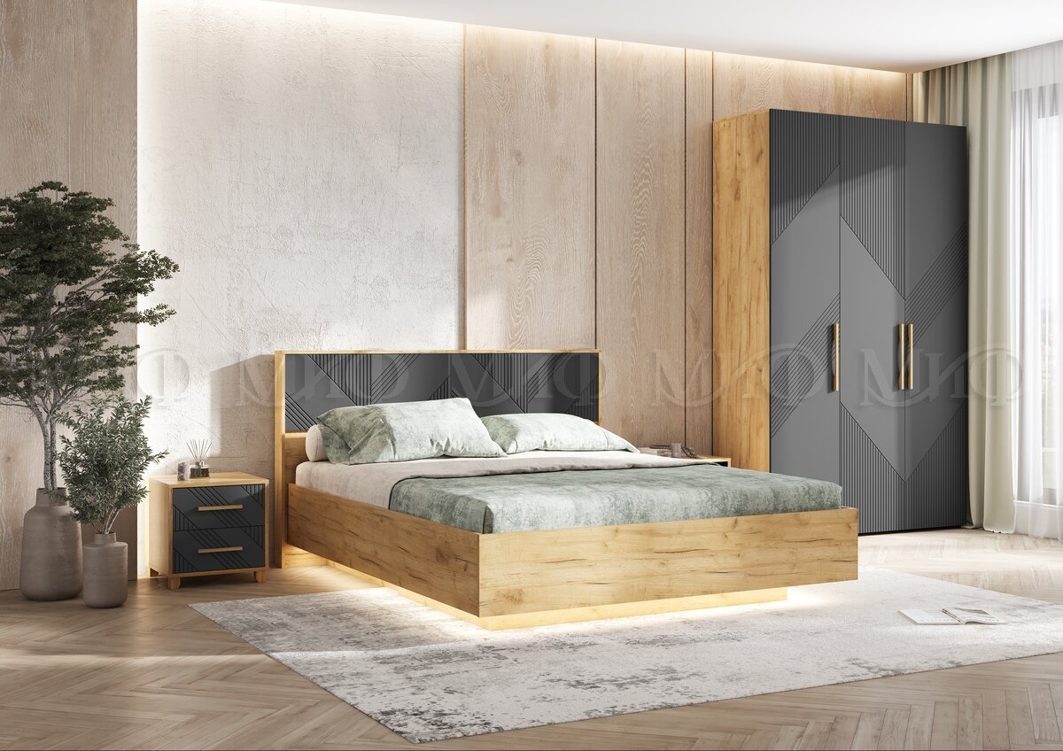 - Кровать парящая 1600 Ирис (с ПМ) Браш Графит/Дуб Крафт