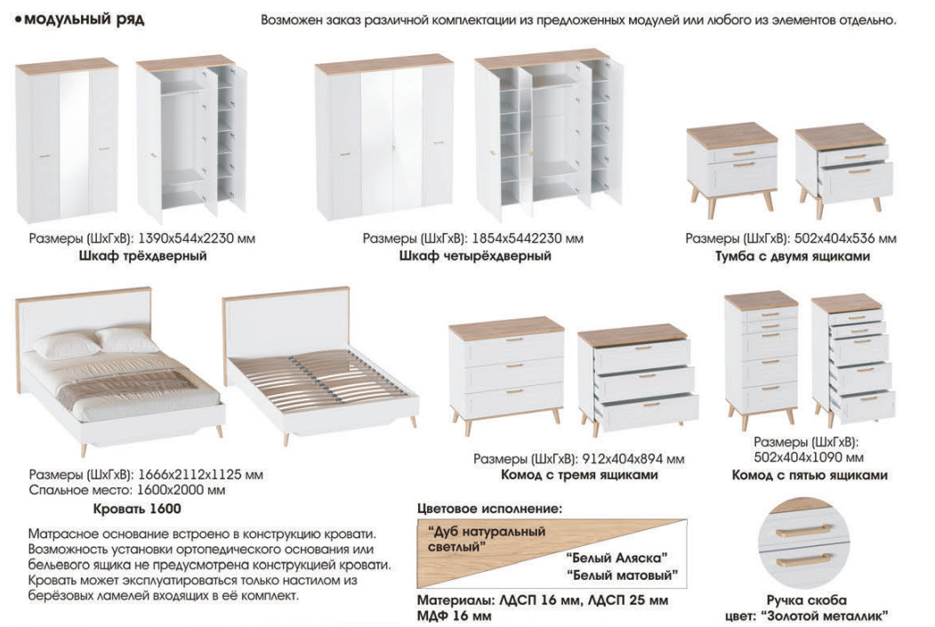 Цена за комплект: шкаф 4 двери, кровать, тумба, комод 3 ящика