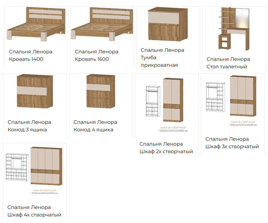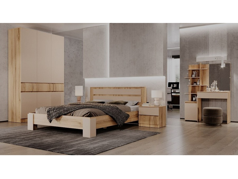 Цена указана за комплектацию: Шкаф 3х створчатый, Кровать 1400, Тумба прикроватная, Стол туалетный