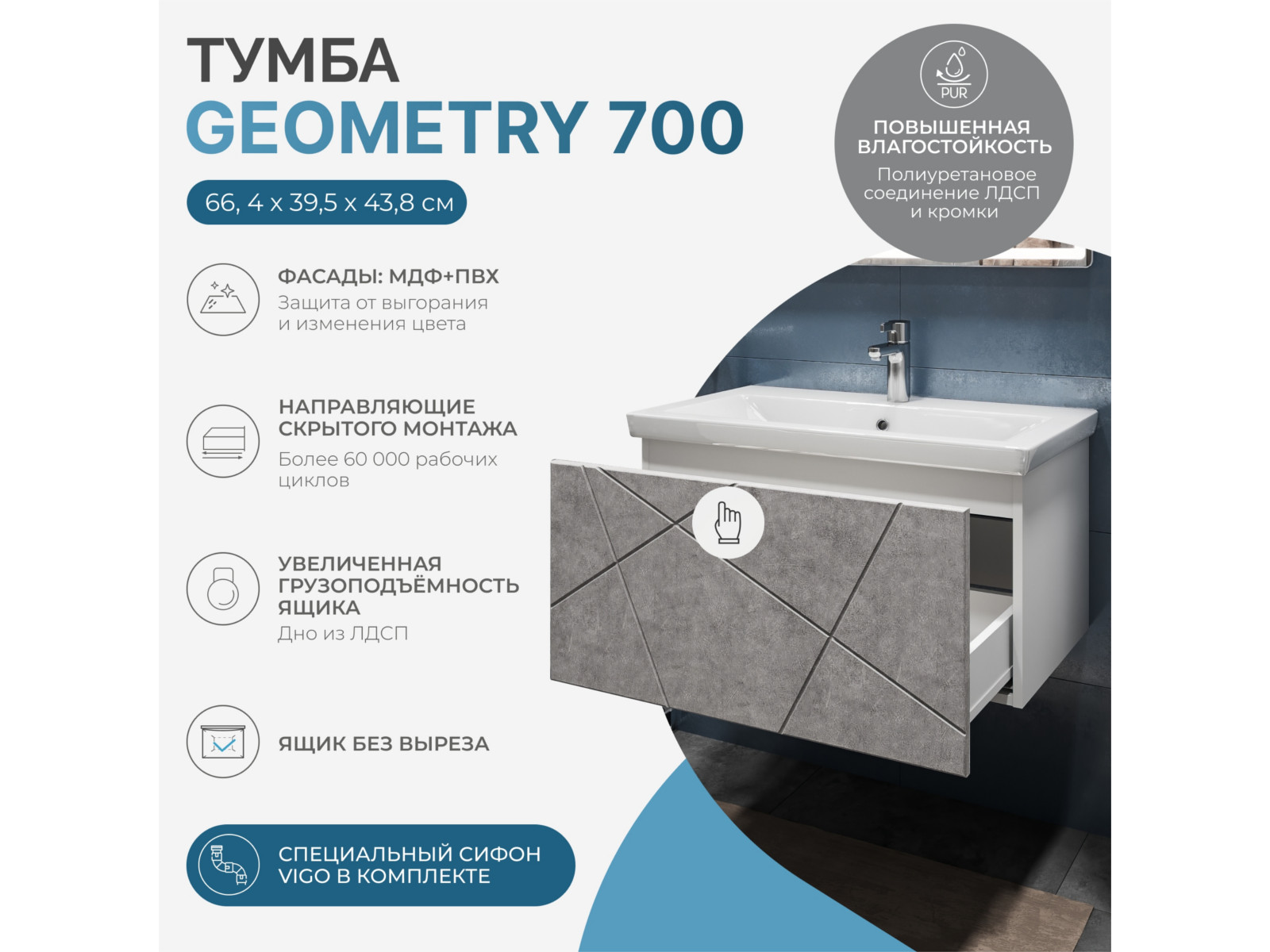 Размер тумбы с раковиной (ШxГxВ): 700x450x420 мм