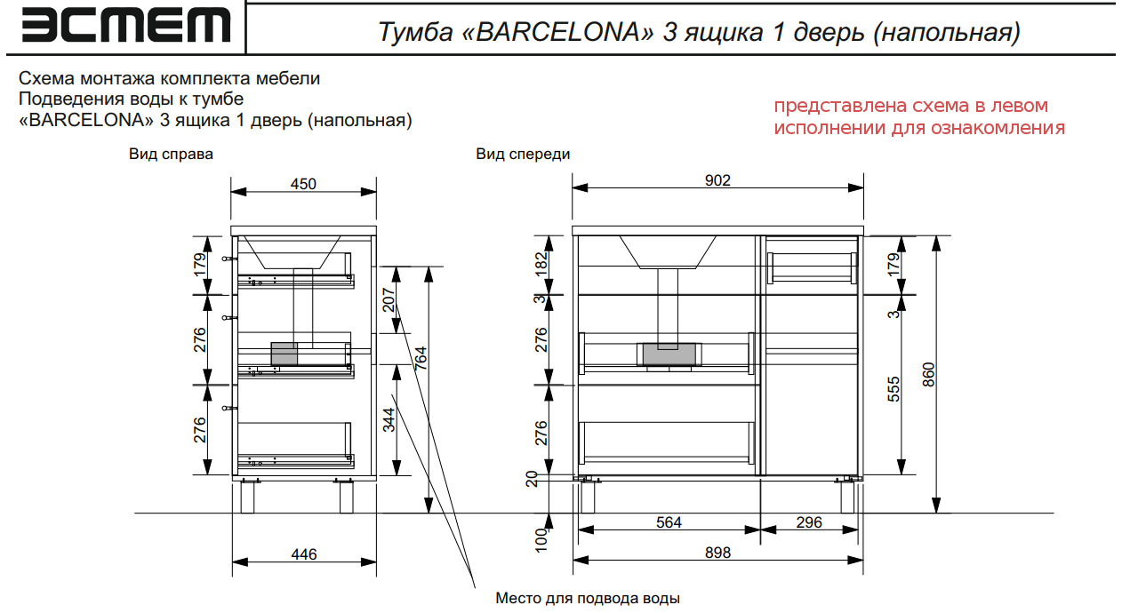 Тумба с раковиной Barcelona 900 правосторонний напольный 3 ящика 1 дверь