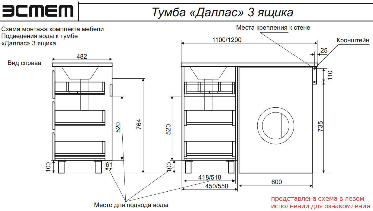 - Тумба с раковиной Dallas Luxe 1200 напольная 3 ящика правая