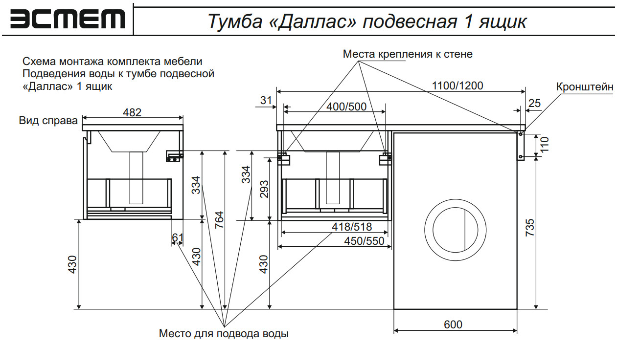Тумба с раковиной Dallas Luxe 1200 навесная 1 ящик левая
