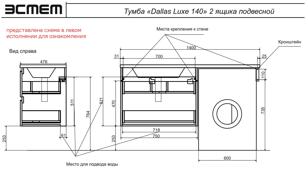 - Тумба с раковиной Dallas Luxe 1400 навесная 2 ящика правая