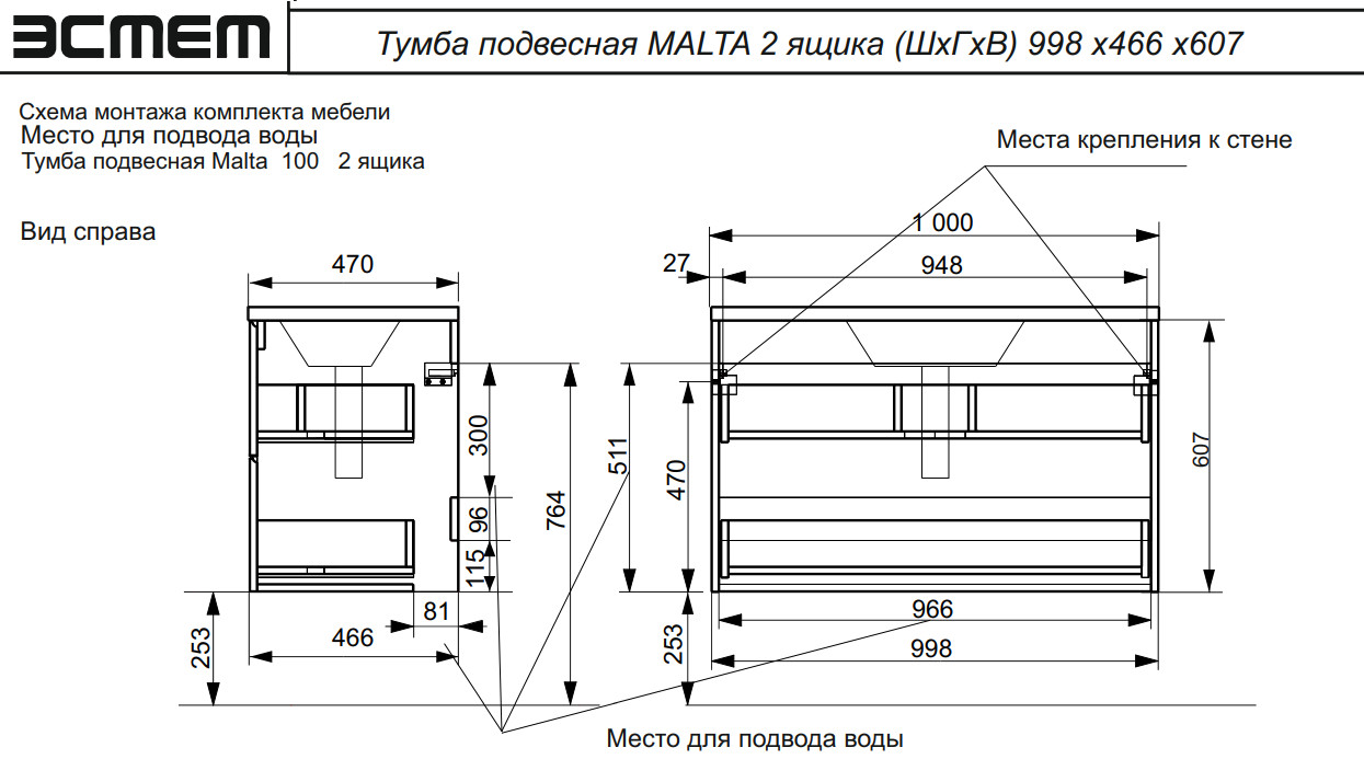 - Тумба с раковиной Malta 1000 навесная 2 ящика