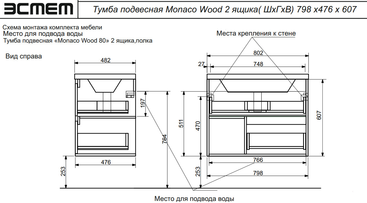 - Тумба с раковиной Monaco Wood 800 2 ящика с нишей