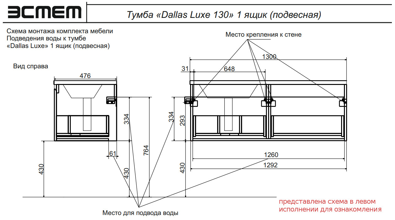 - Тумба с раковиной справа Dallas Luxe 1300 навесная 1 длинный ящик