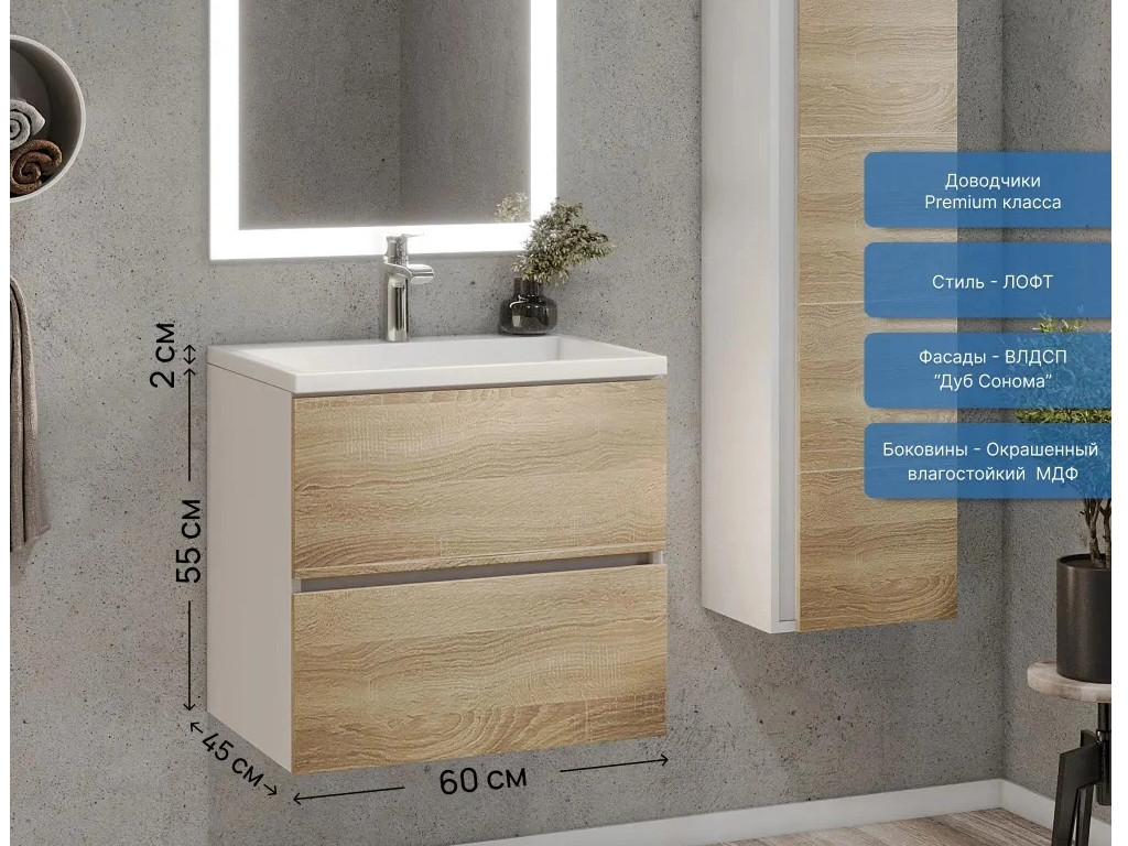 Фасад - ЛДСП в пленке под дерево, цвет дуб сонома. Выдвижные ящики изготовлены из влагостойкой ЛДСП. Ящики оснащены доводчиками. Фурнитура и доводчики премиум класса.
