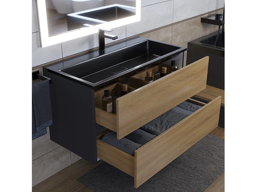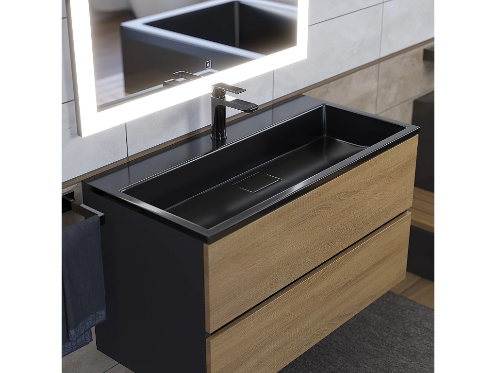 - Тумба с раковиной Uperwood Barsa 90 см раковина черный глянец-тумба черная/дуб сонома