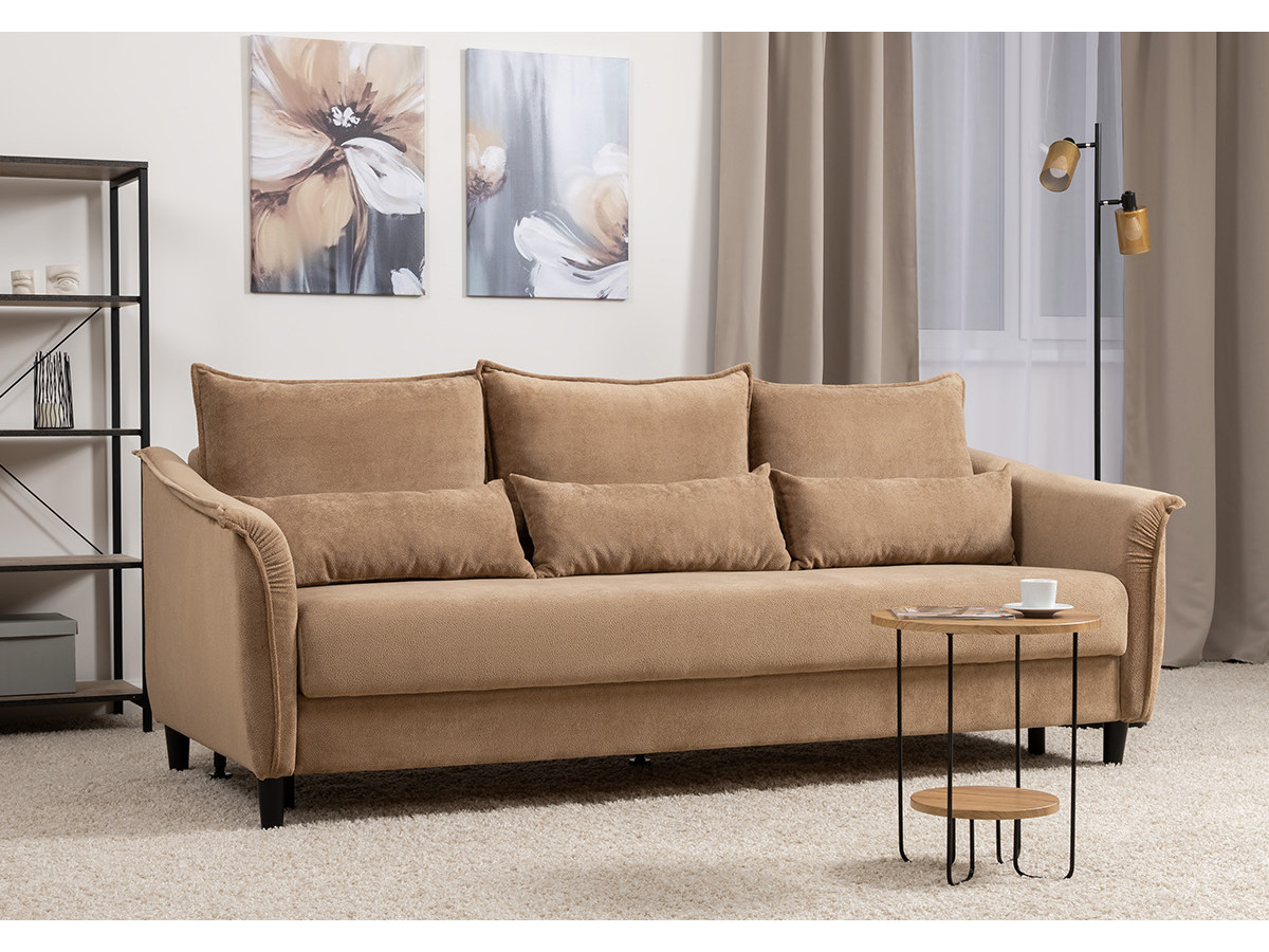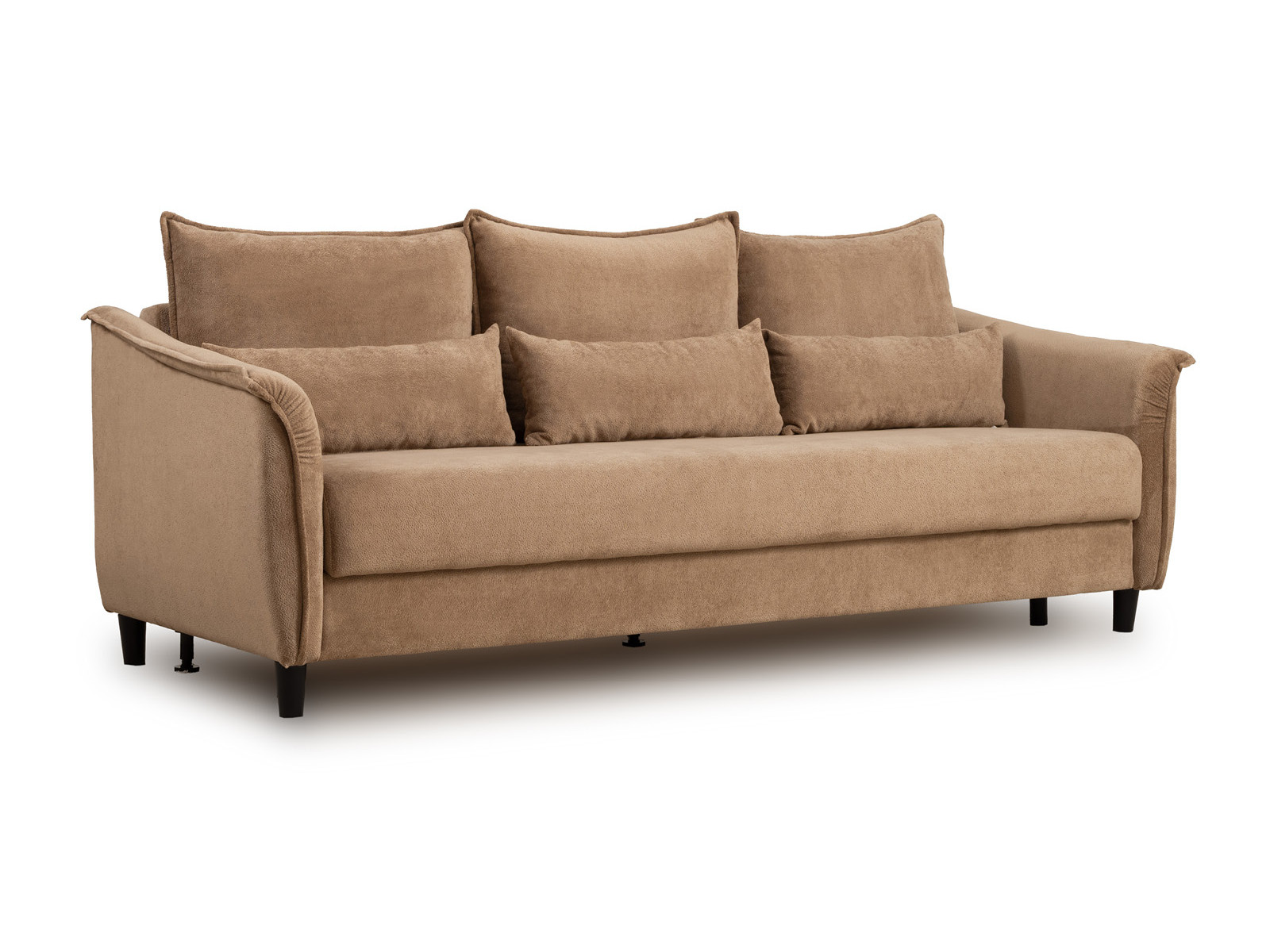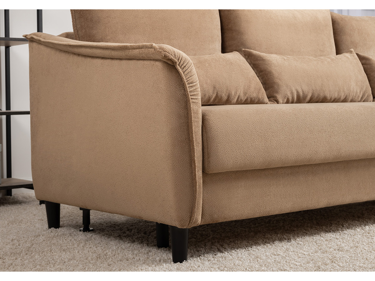 Спинка с тремя приспинными подушками. Две подушки трапецивидной формы, центральная квадратной формы на молнии, по трем сторонам которых проложена отделочная строчка на 1,2 см. По контуру боковин проложен декоративный кант на 1,2 см из основной ткани. Кант проходит по центру передней части боковины, а по внутренней верхней части сборка.