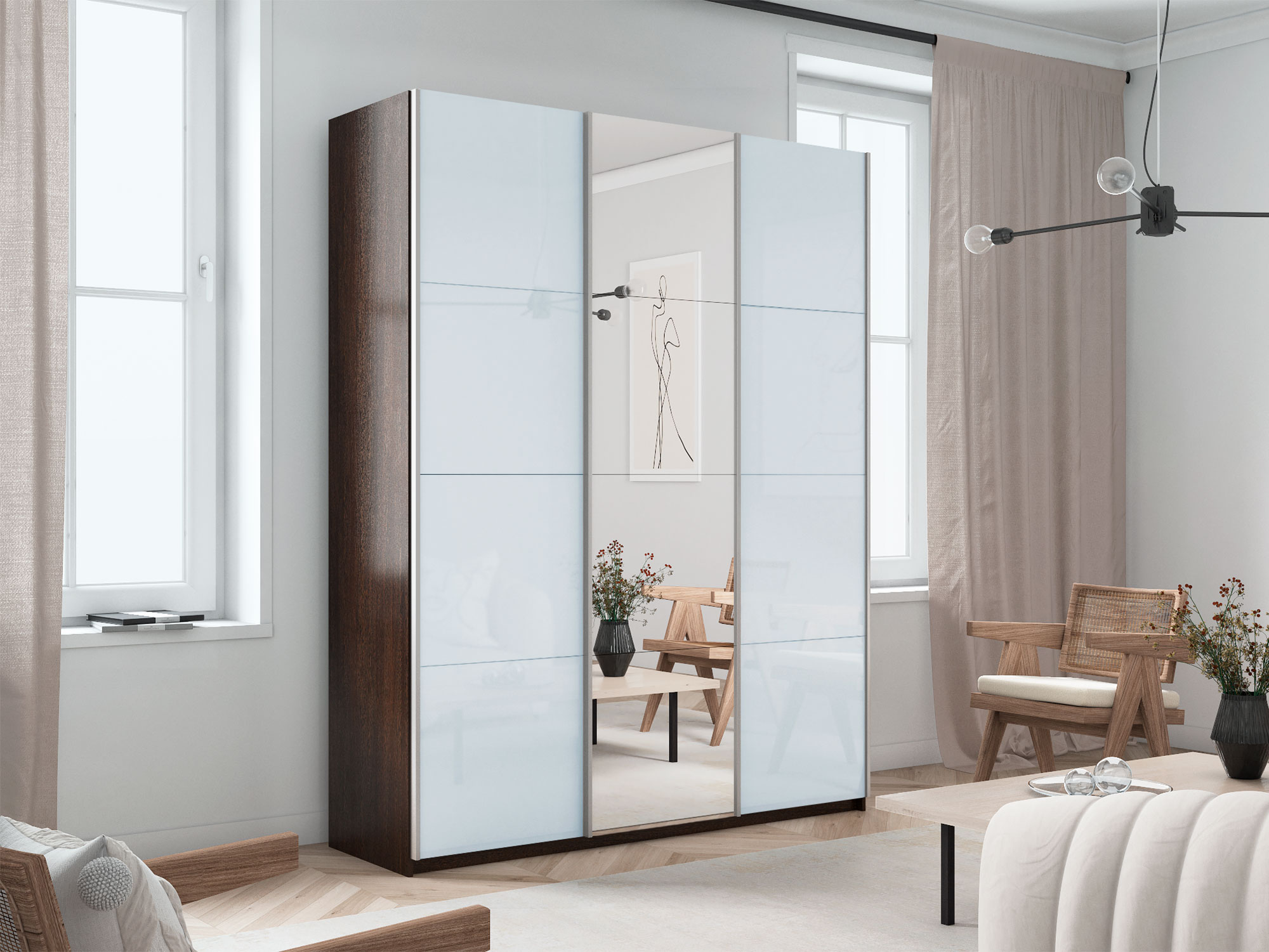 - Шкаф-купе Прайм 3-х дверный 2100 два Стекла Белые/Зеркало Венге
